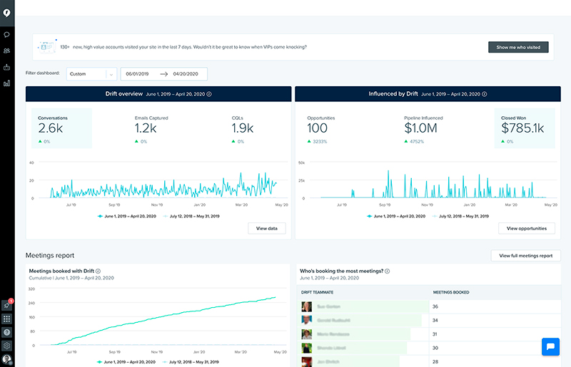 One of the biggest advantages with DRIFT; direct Salesforce integration, so connecting visitors with the right team members at the right time is seamless. Additionally, tracking the influence of live chat on sales opportunities is simple using the built-in dashboard.